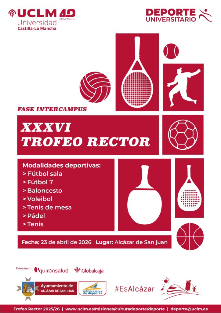 Alcázar de San Juan será sede el próximo jueves 23 de abril de la fase final intercampus del XXXVI Trofeo Rector de la Universidad de Castilla-La Mancha, una cita que, por primera vez, concentrará en una única jornada y en un mismo espacio todas las modalidades deportivas convocadas dentro de esta competición universitaria, coincidiendo además con la conmemoración del 40 aniversario de la institución académica.