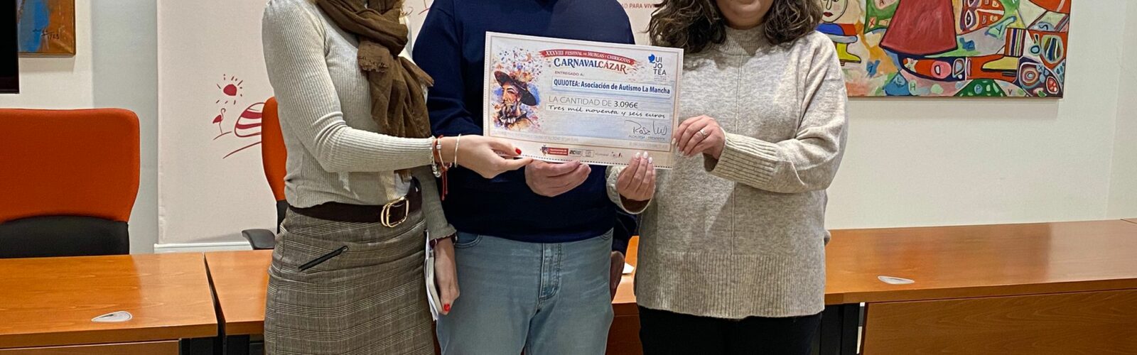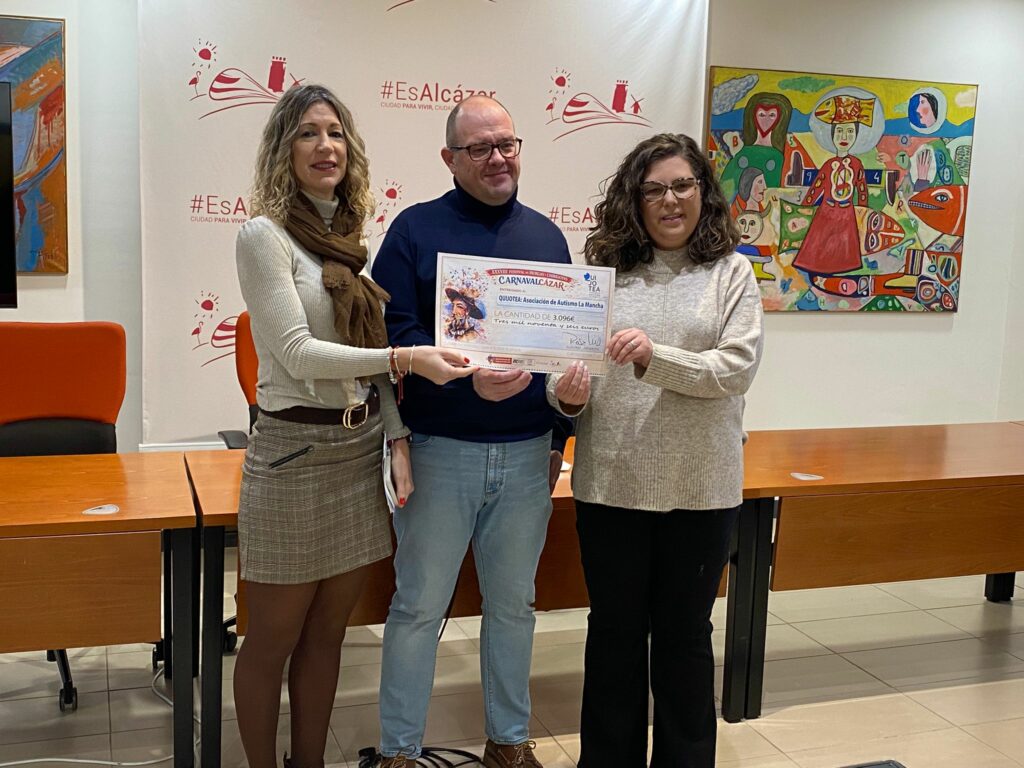 El Ayuntamiento de Alcázar de San Juan ha formalizado esta mañana la entrega de la recaudación del Festival de Chirigotas celebrado durante el pasado Carnaval de Alcázar. El concejal Javier Castellanos ha hecho entrega de un cheque por valor de 3.096 euros a la Asociación Autismo La Mancha ‘Quijotea’, fruto de un evento para el que no sobró ningún asiento.