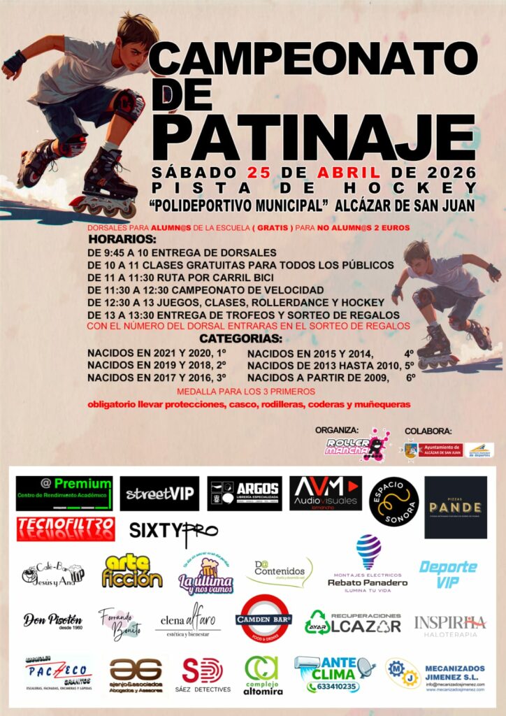 Alcázar de San Juan será escenario el próximo sábado 25 de abril de 2026 de un Campeonato de Patinaje que reunirá a participantes de distintas edades en la pista de hockey del Polideportivo Municipal. La jornada, organizada por Roller Mancha con la colaboración del Ayuntamiento de Alcázar de San Juan, está diseñada como un evento deportivo abierto a toda la ciudadanía.