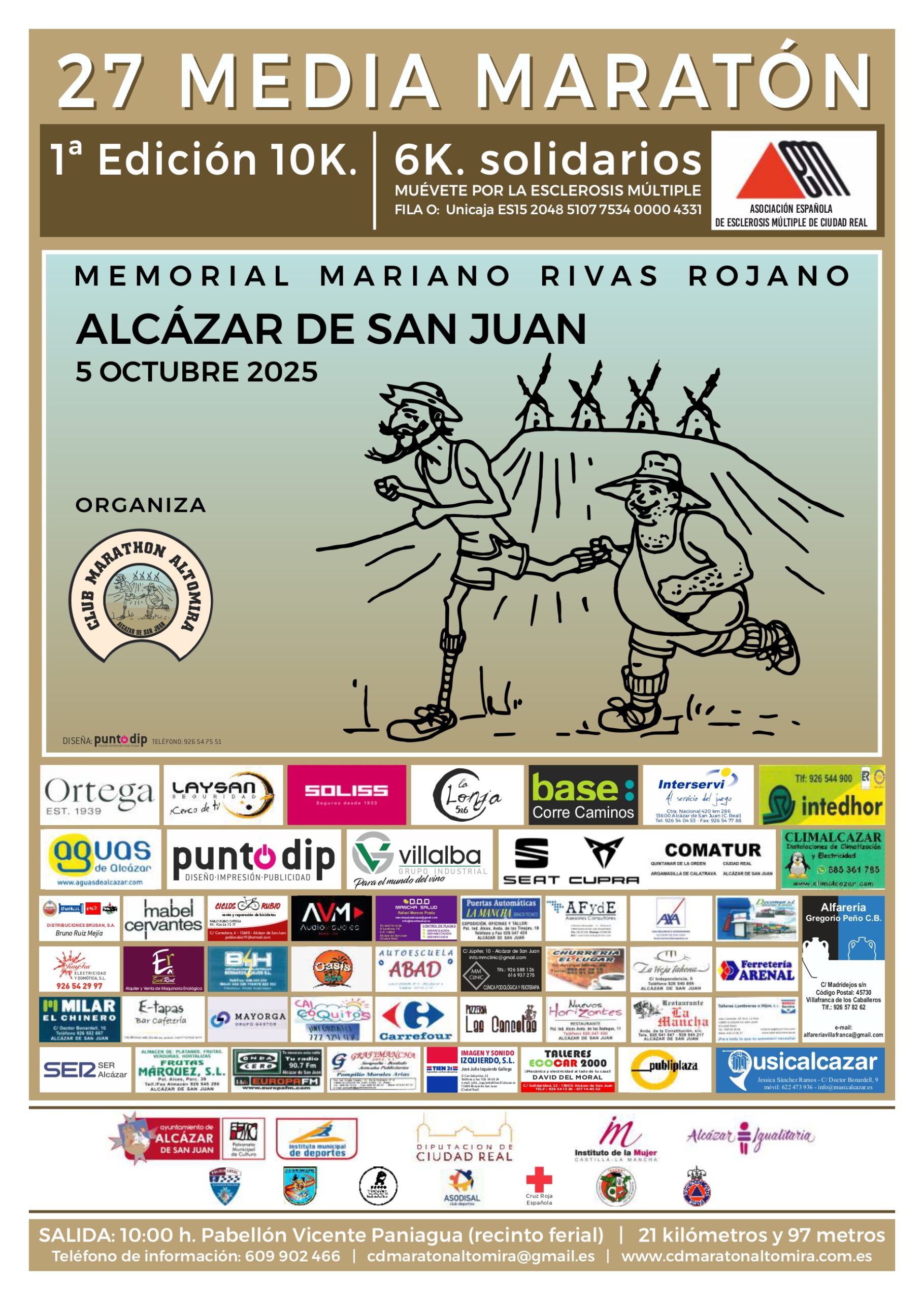 El Club Maratón Altomira, acompañado por la Concejalía de Deportes del Ayuntamiento de Alcázar de San Juan, ha presentado esta mañana la XXVII edición de la Media Maratón de Alcázar de San Juan, que se celebrará el próximo domingo 5 de octubre a las 10:00 horas. La principal novedad de esta edición será el traslado de la salida y la meta al Recinto Ferial, debido a las obras que se están acometiendo en la Avenida del Deporte, y la inclusión por primera vez de una Carrera 10K, que se suma a la protagonista Media Maratón, la Carrera Solidaria por la Esclerosis Múltiple y la Prueba Adaptada.
