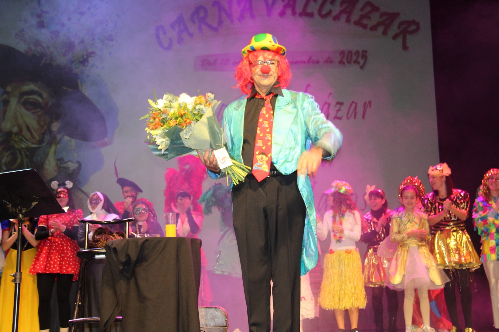El Teatro Emilio Gavira acogió el pasado viernes 12 de diciembre la inauguración oficial del Carnaval 2025 de Alcázar de San Juan, con un emotivo y divertido pregón a cargo de Paco Librado, técnico de Cultura y figura clave del carnaval local desde los años 80. El pregonero ofreció un espectáculo divertido, apareciendo en escena caracterizado como Frankenstein, más tarde como un payaso, después como el humorista Eugenio y finalmente de nuevo como miembro de El Tiznao, peña del alma donde tan buenos momentos carnavaleros disfrutó hace décadas.