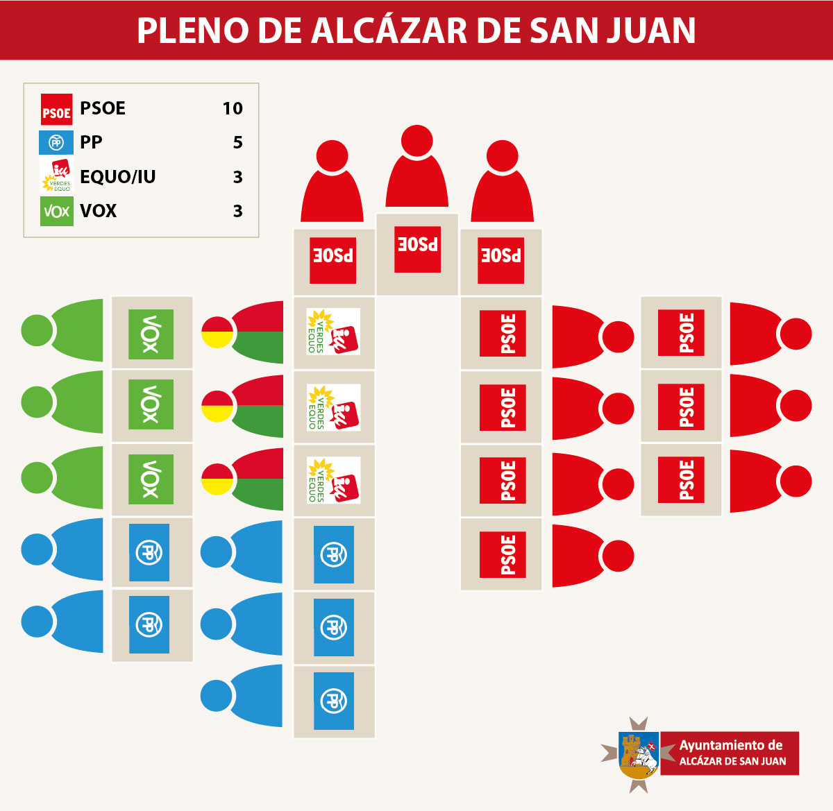 El pleno de Alcázar de San Juan, está formado por 21 concejales, distribuidos durante este mandato del 2023 al 2027, entre cuatro grupos políticos municipales: el Partido Socialista con 10, el Partido Popular con 5, EQUO-Verdes-IU con 3 y VOX con 3 ediles respectivamente.
