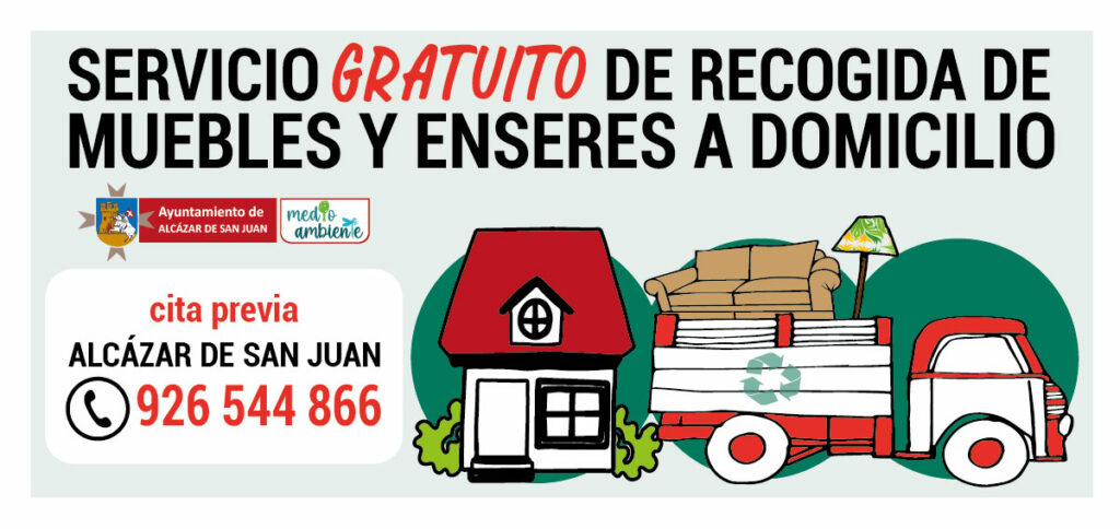 El servicio de Ciudades Sostenibles de la Concejalía de Medio Ambiente, ofrece el servicio gratuito de recogida de muebles y enseres a domicilio. Para poder hacer uso de este servicio debe solicitar cita previa en el teléfono 926 544 866 o personarse en las oficinas de Medio Ambiente del Ayuntamiento.